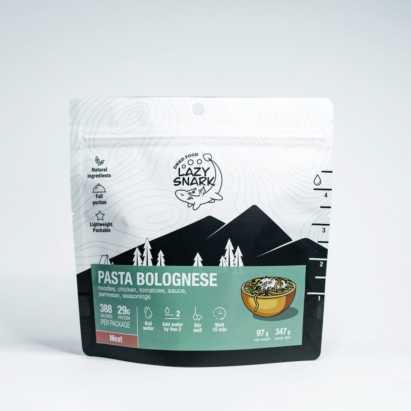 - Add 200-500 ml of boiling water according to the line indicated at the right side of the package (it depends on the dish, follow the instructions on the package)