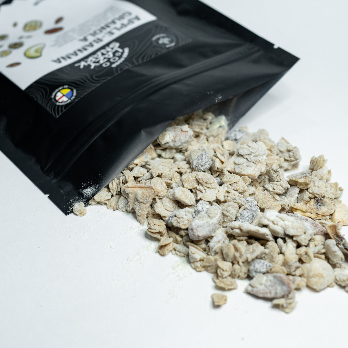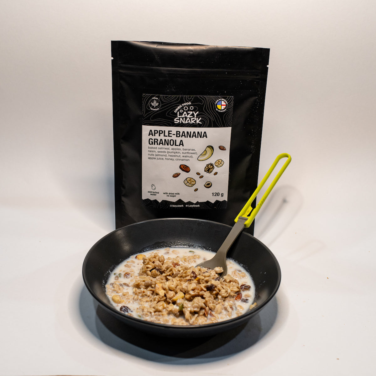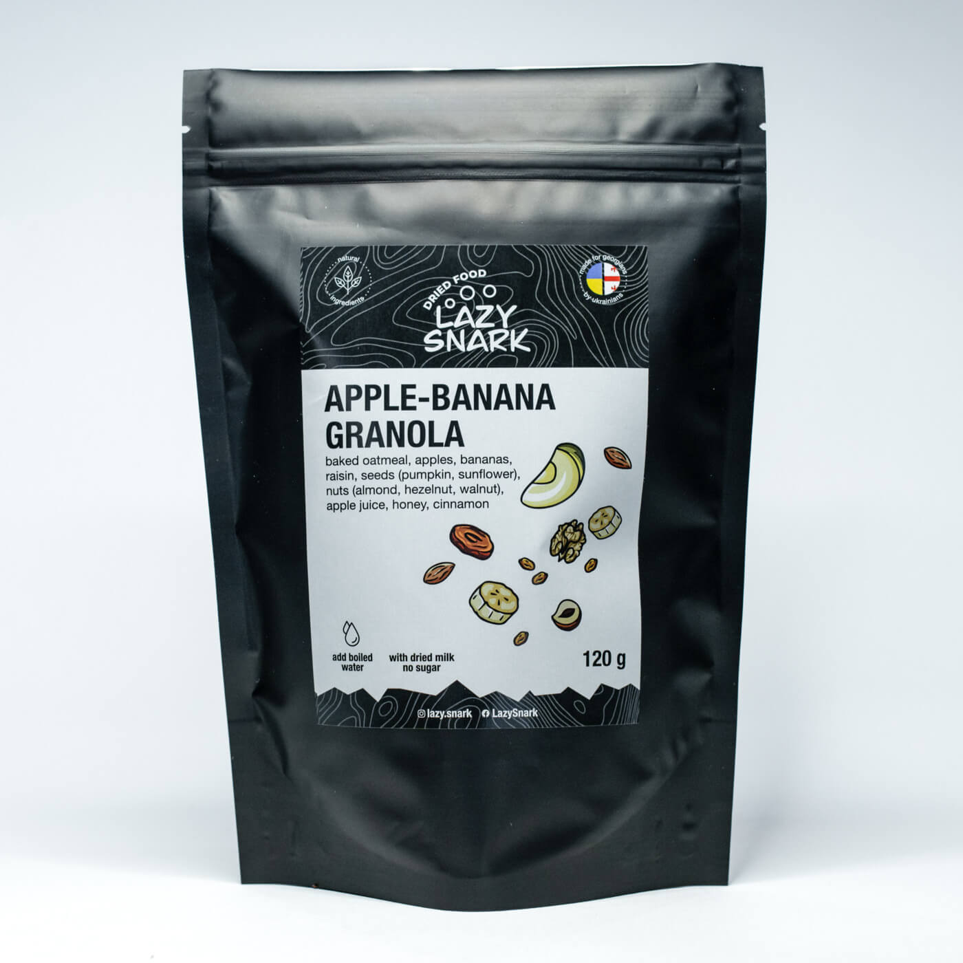 Ingredients: baked oatmeal, apples, bananas, raisin, seeds (pumpkin, sunflower), nuts (almond, hazelnut, walnut), apple juice, honey, cinnamon, dried milk (20 grams)