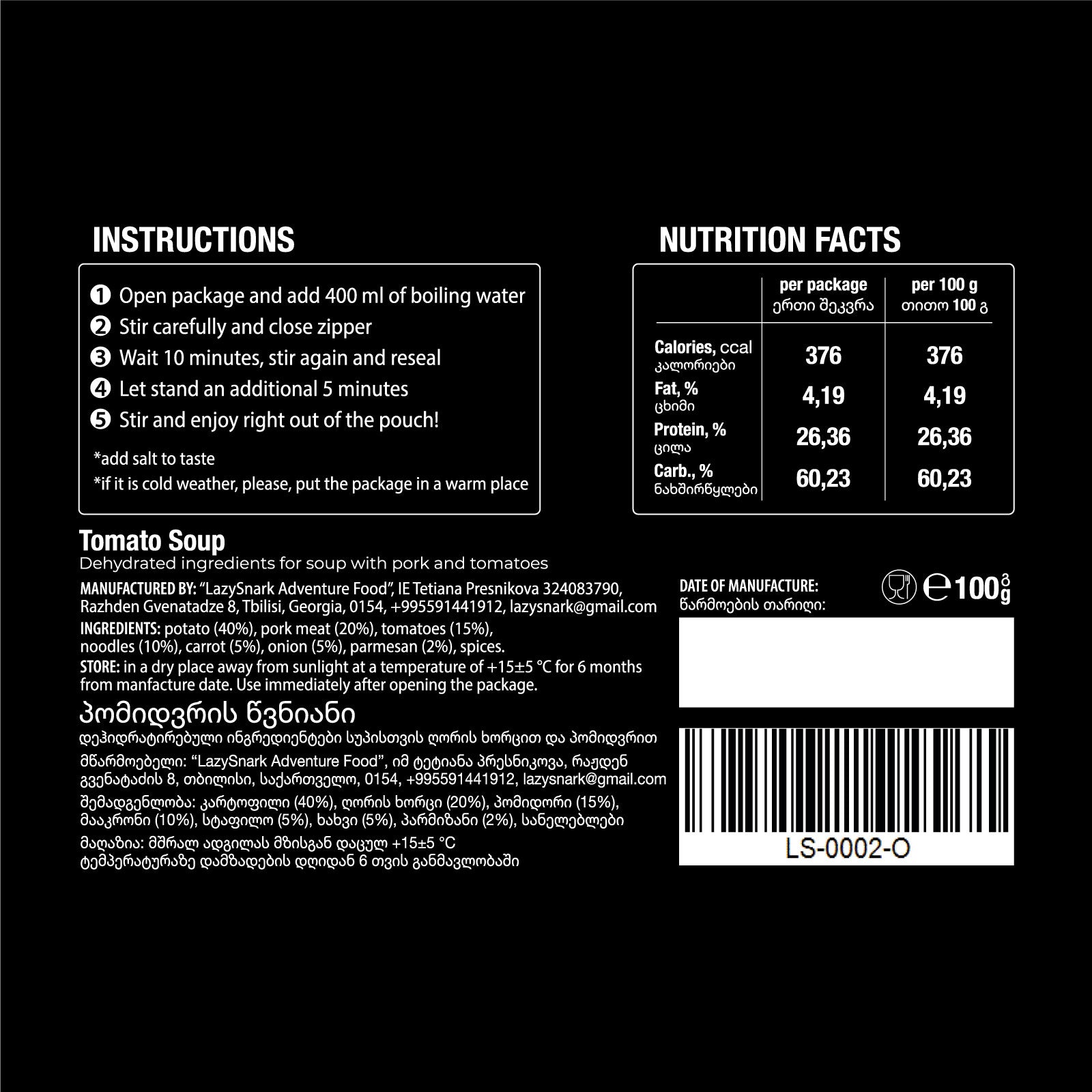 Ingredients (vegetarian): potato (40%), soy meat (20%), tomatoes (15%), noodles (10%), carrot (5%), onion (5%), parmesan (2%), seasonings.