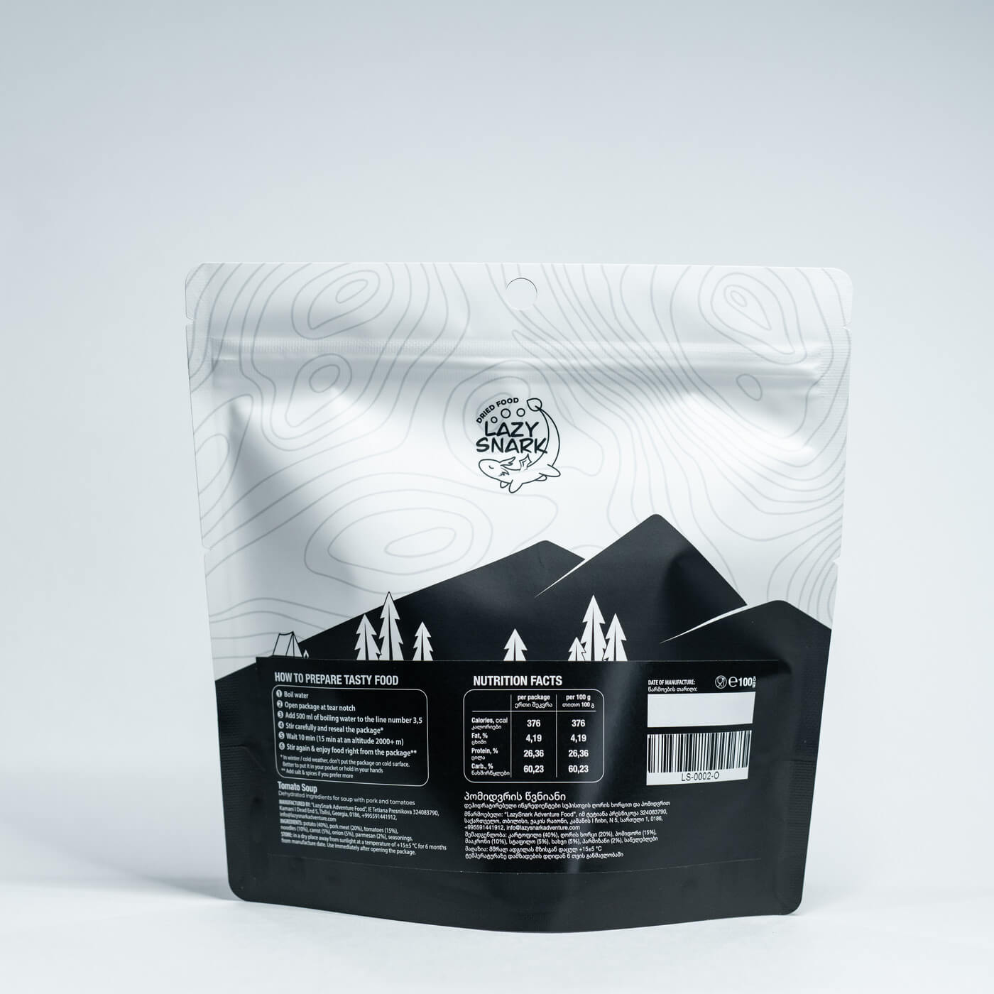 Ingredients (meat): potato (40%), pork meat (20%), tomatoes (15%), noodles (10%), carrot (5%), onion (5%), parmesan (2%), seasonings.